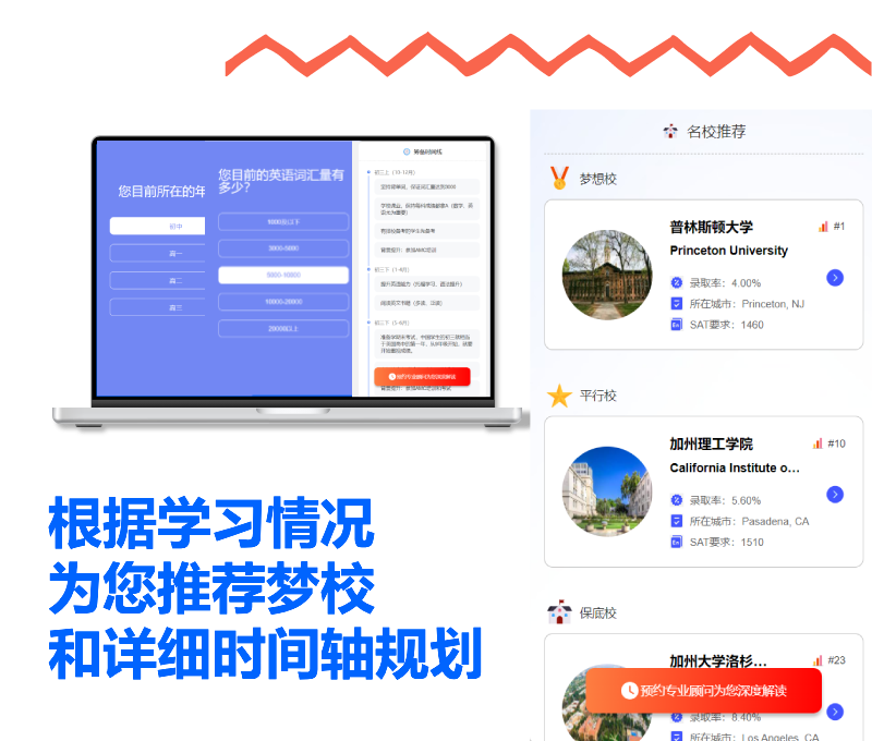 择校规划:为初中、高中生,大学生制定留学规划,选择合适的梦校,生成学习时间轴。